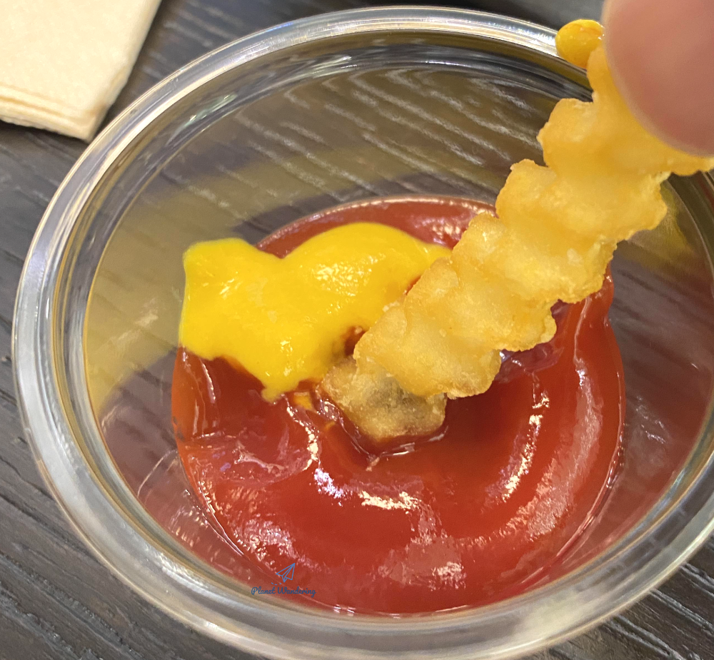 감자 맛이 특이하지는 않지만 갓 튀겨서 뜨겁게 나오는 확률이 높아 좋습니다. 손으로 잡기 뜨거울 만큼 바삭하고 뜨겁게 나올 때가 많죠. 머스타드소스를 케쳡과 섞어 찍어 먹는 것도 나름 괜찮은 맛을 냅니다.