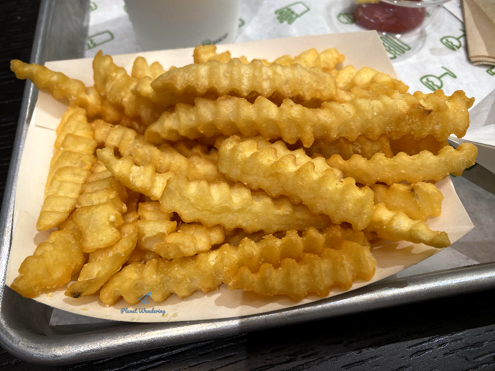 요 녀석이 쉑쉑버거의 슈롬버거입니다. 감자와 탄산음료는 따로 주문한 거니 세트라고 부르기는 민망하군요. 케첩과 머스타드 소스는 셀프바에서 셀프로 준비하셔야 하죠. 감자는 맥도날드나 버거킹 감자보다는 큽니다. 표면에 오돌토돌하게 마무리한 게 대형할인마트에서 파는 냉동감자 친구인가,, 싶은 생각이 들죠.