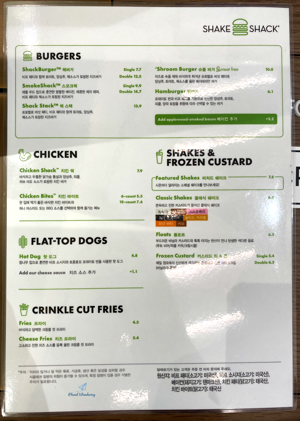 주문은 입구 쪽 테블릿을 이용하거나 카운터 직원에게 할 수 있습니다. 쉑쉑의 명성에 어울리지 않게 코팅지로 만든 메뉴판이 이채롭군요. 하긴, 맥도날드나 버거킹도 비슷한 것 같긴 하네요. 기본이 되는 쉑버거를 비롯한 버거는 가장 싼 게 7,700원이고 올라가면 14,900원까지 있습니다. 세트메뉴는 없고 감자, 음료는 별도로 주문해야 해서 가격대가 상당히 높습니다. 크링클 컷 프라이라 부르는 감자튀김은 4,300원이고 탄산음료는 기본이 2,900원입니다.