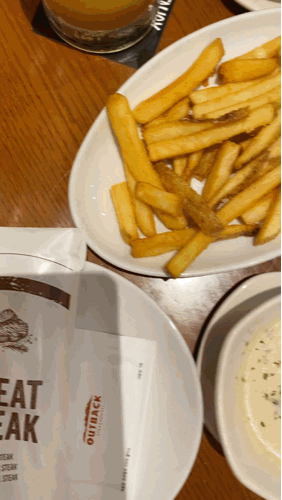 예전보다 작아진 부시맨 빵이 먼저 나왔습니다. 올 때마다 느끼지만 아웃백 스테이크하우스의 빵 인심과 냅킨 인심은 초박형으로 많이 얇아졌습니다. 분식집에 가도 있는 종이 냅킨은 찾아볼 수 없고, 직원 분에게 요청을 해야 냅킨과 물티슈를 얻어 쓸 수 있죠. 부시맨 빵도 2명이 가나 5명이 가나 일단 빵 하나만 나옵니다. 아쉬운 부분들이죠.