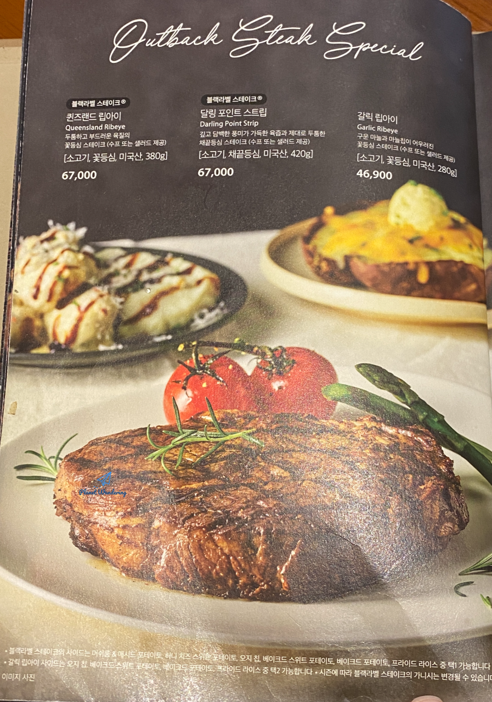 아웃백스테이크하우스 메뉴판 맨 첫 장에 있는 블랙라벨 커플세트를 선택했습니다. 블랙라벨 커플세트는 스테이크와 함께 파스타 1종, 스프 2개, 에이드 2잔, 커피 2잔, 그리고 사이드메뉴 1개로 구성됩니다. 가격은 115,000원이죠. 2인 기준이니 1인 객단가가 57,500원으로 가격대는 상당히 높은 편입니다.