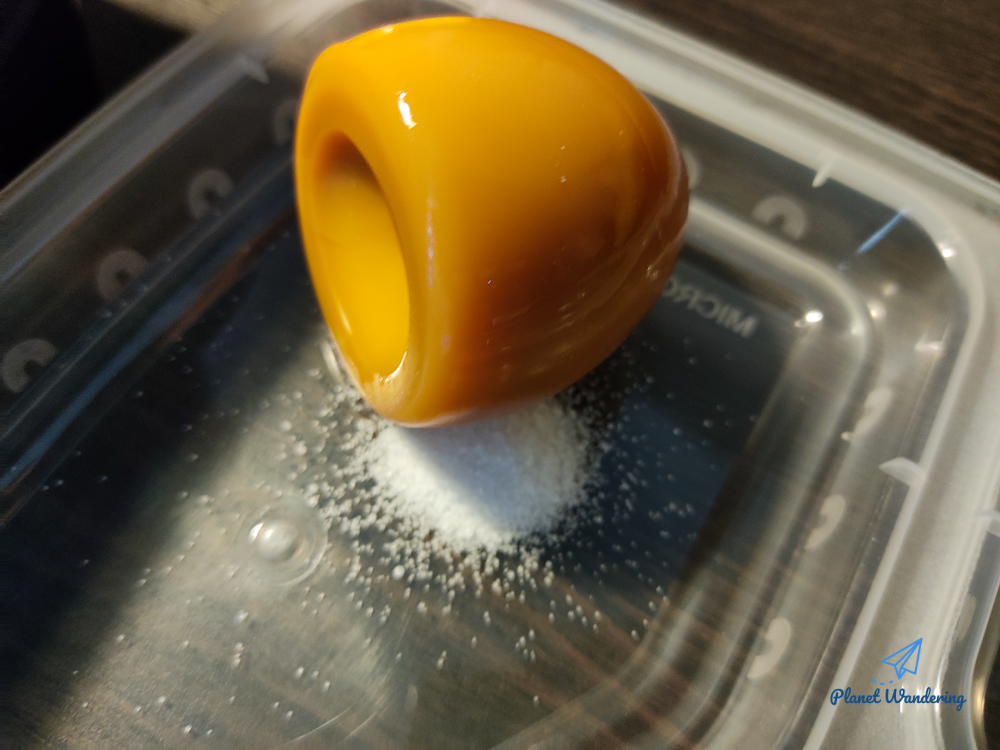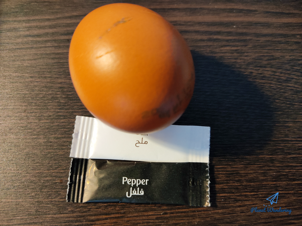 이 대목에서 그냥 먹으면 재미가 없겠죠? 아끼고 아껴 가져온 기내식 소금이 제 몫을 할 차례입니다. 달걀을 곱게 까서 에미레이트항공 소금을 살살 뿌려 맛있게 먹었습니다.