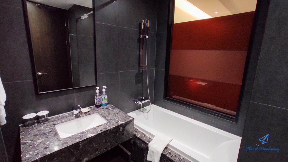 욕실도 깔끔합니다. 공용으로 사용하는 바디워시와 샴푸가 있고 비누와 면봉 등 어메니티는 호텔용으로 따로 준비되어 있습니다. 호텔답게 수건도 깨끗하고 일회용 슬리퍼도 준비되어 있습니다. 욕조에 물을 받아 목욕이나 해볼까 했는데 욕조 마개가 없습니다.