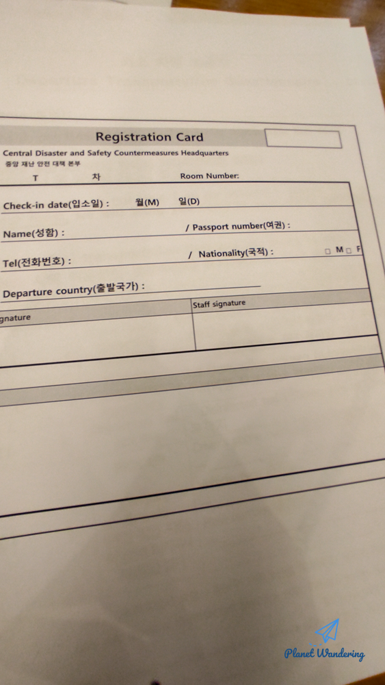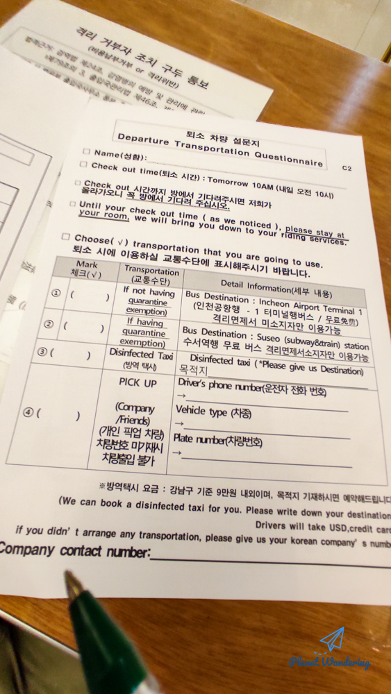 들어오는 순서에 따라 자리에 앉으면 먼저 설문지와 숙박카드를 작성해야 합니다. 그리고 가장 중요한, 다음 날 아침 10시에 음성판정을 받고 퇴소를 하게 되면 어디로 갈 것인가입니다.