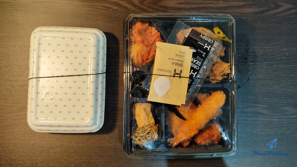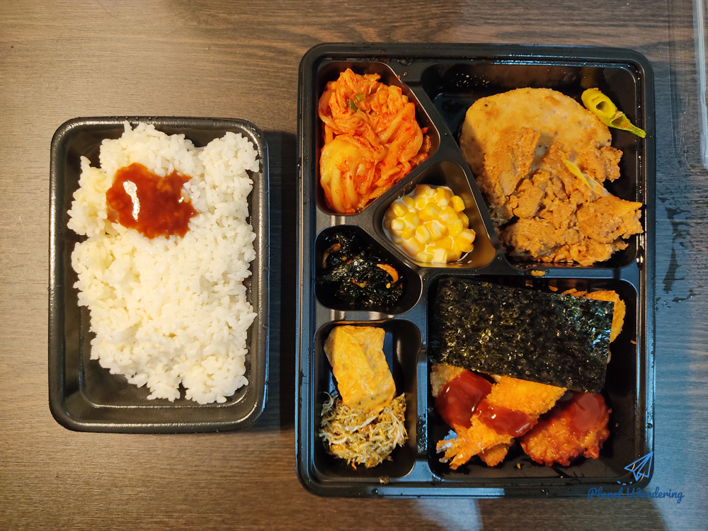 상황 파악도 끝났고, 내일 오전 10시까지 나갈 수도 없으니 이제 모든 걸 내려놓고 밥이나 먹을 차례입니다. 입구에서 받아온 도시락은 그래도 입실 시간에 맞춰 준비된 건지 약간의 온기가 남아있습니다.