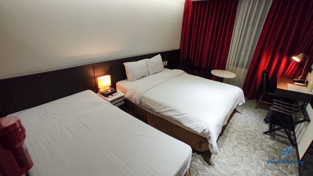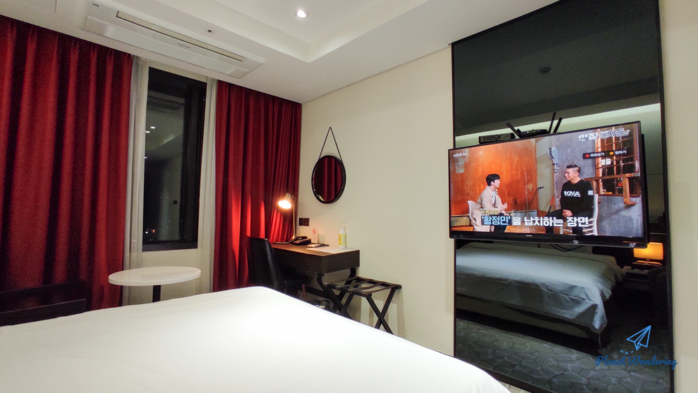 객실 꾸밈새와 크기는 좋은 비즈니스호텔 정도로 느껴졌습니다. 침대는 싱글 하나 더블 하나가 있는데 싱글침대에는 침구류가 세팅되어 있지 않았습니다. 인터넷도 잘 되고 TV도 IPTV가 들어와 있었습니다.