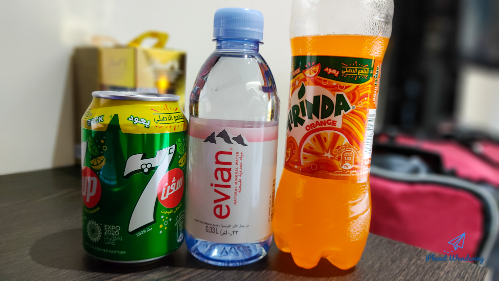 방랑객은 음료수를 좋아하는 편이라 음료도 충분히 준비했습니다. 세븐업과 생수는 두바이의 에미레이트항공 라운지에서 가져온 것이고 미린다는 초콜릿 등 선물을 사면서 비행 중에 마시려고 사둔 겁니다.