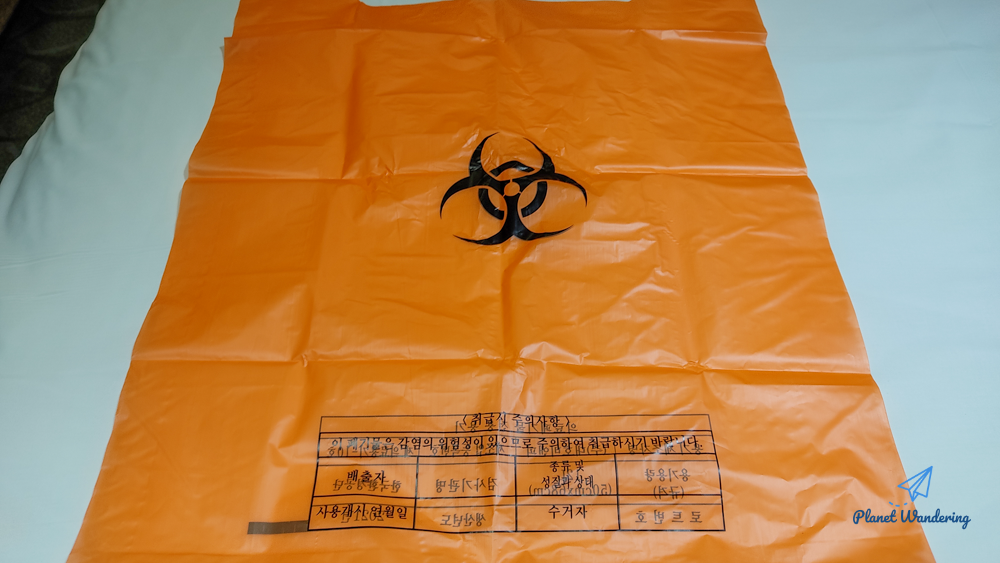 해외 입국자는 음성 판정이 나올 때까지는 일종의 보균자로 취급받기 때문에 모든 폐기물은 의료용 폐기물 봉투에 넣어 소각하게 되죠. 남은 음식물이며 등등 모든 걸 이 커다란 쓰레기봉투에 담아 모았습니다.