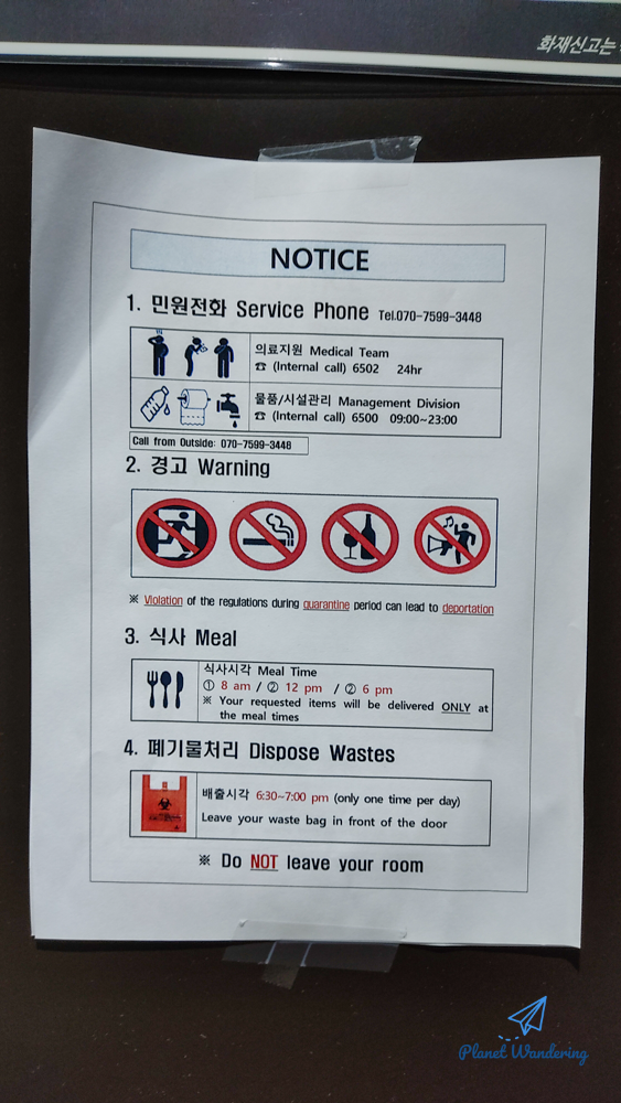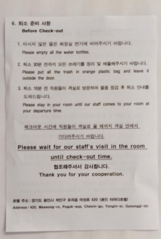R 용인 호텔은 1박의 짧은 격리입국자도 투숙을 하지만, 7일 또는 14일 격리를 하는 국내외 입국자도 투숙을 합니다. 그래서 외국어로도 많은 안내가 되어있고 친절하지만 상당히 엄격하게 투숙객들을 대합니다. 규정을 어기면 가만두지 않겠다는 경고문도 붙어있습니다.