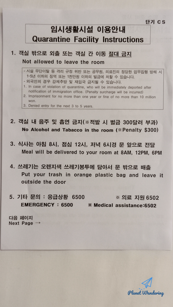 임시생활시설 안내문도 받았습니다. 너무도 당연하게 내일 아침 10시 퇴소까지는 객실 밖으로 나와서는 안되고 (짐 검사를 하지는 않았지만) 음주와 흡연도 금지입니다. 아침식사는 다음날 아침 8시에 객실 밖에 놓아둔다고 했는데 8시에 동시에 여러 객실에서 문을 열지는 말아달라는 당부도 있었습니다.