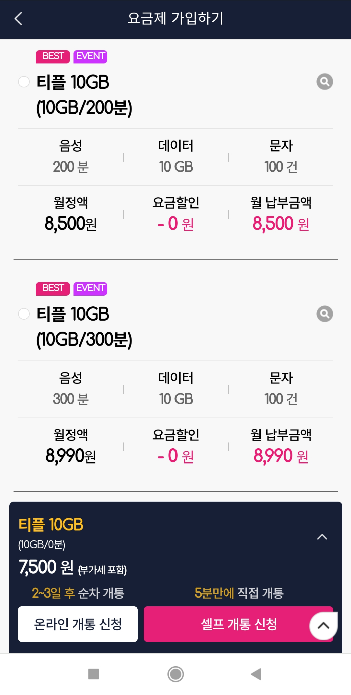 무제한 통화라는 표현 대신, 통화량이 몇 천 분이라는 요금제도 종종 있는데 특수한 일을 하는 분들을 제외하고는 무제한 요금제 사용자들의 실제 월간 통화량이 300분 내외라는 통계 자료도 있었죠. 그래서 300분이라는 통화량이면 충분하다고 판단을 했습니다. 게다가 요즘 알뜰폰 회사들이 7개월 내외의 할인기간을 설정해두고 그 기간만큼만 요금을 0원으로 하거나 큰 폭의 할인을 해주기는 하는데, 어차피 7개월 지나면 요금이 올라가는 형태라 티플러스 모바일의 LGT 티플 10GB 요금제가 최선이라고 생각을 했습니다.