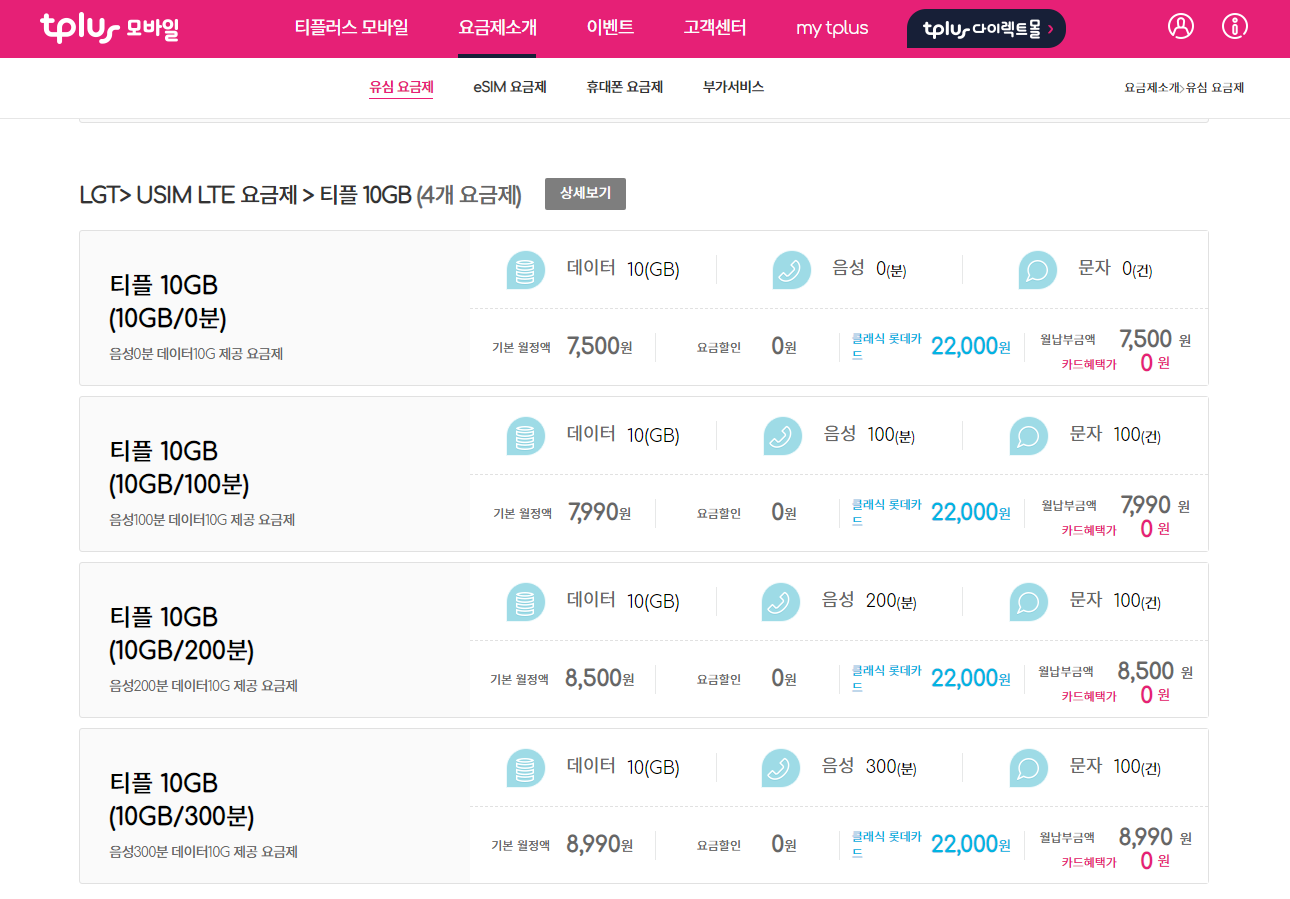 티플러스 모바일의 티플 10GB 요금제는 4가지 상품이 있습니다. 데이터는 10GB로 동일하고, 통화량만 0분에서 300분까지로 구분됩니다. 0분짜리 요금제는 통화가 안되는 게 아니라 무료통화 제공량 없이 (정확히는 무료도 아니지만) 통화시간만큼 요금이 붙는 형태입니다. 데이터 사용량 역시 10GB가 넘어가면 추가 요금이 붙는 형태의 요금제입니다.