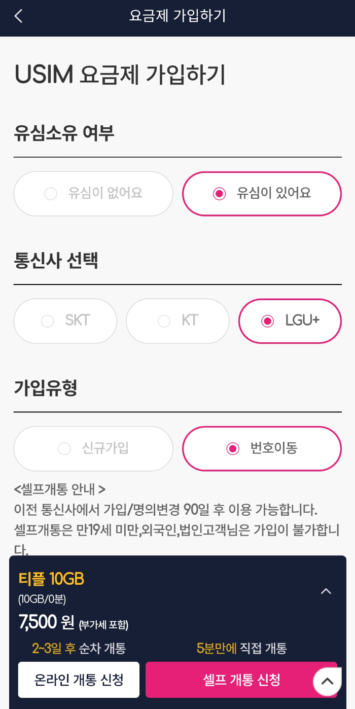 [유심이 있어요], [LGU+]를 선택하고 [번호이동]을 선택합니다. 첫 화면에서는 통화량 제공이 없는 7,500원짜리 요금제가 기본적으로 보여집니다. 제휴카드는 없으니 선택하지 않고, 여기서 맨 아래쪽 요금제 부분을 눌러 가입하려는 요금제를 선택할 수 있습니다. 셀프 개통은 평일과 토요일에 오전 10시~오후 8시 사이에 할 수 있다는 안내가 있습니다. 아쉽게도 셀프개통은 성인 일반인 가입자만 가능하고 미성년자는 온라인 개통을 해야 해서 조금 번거롭습니다.
