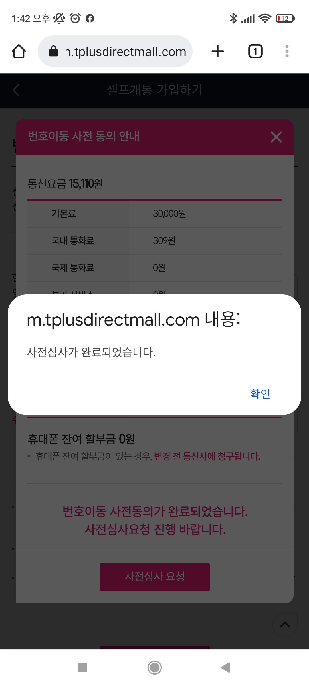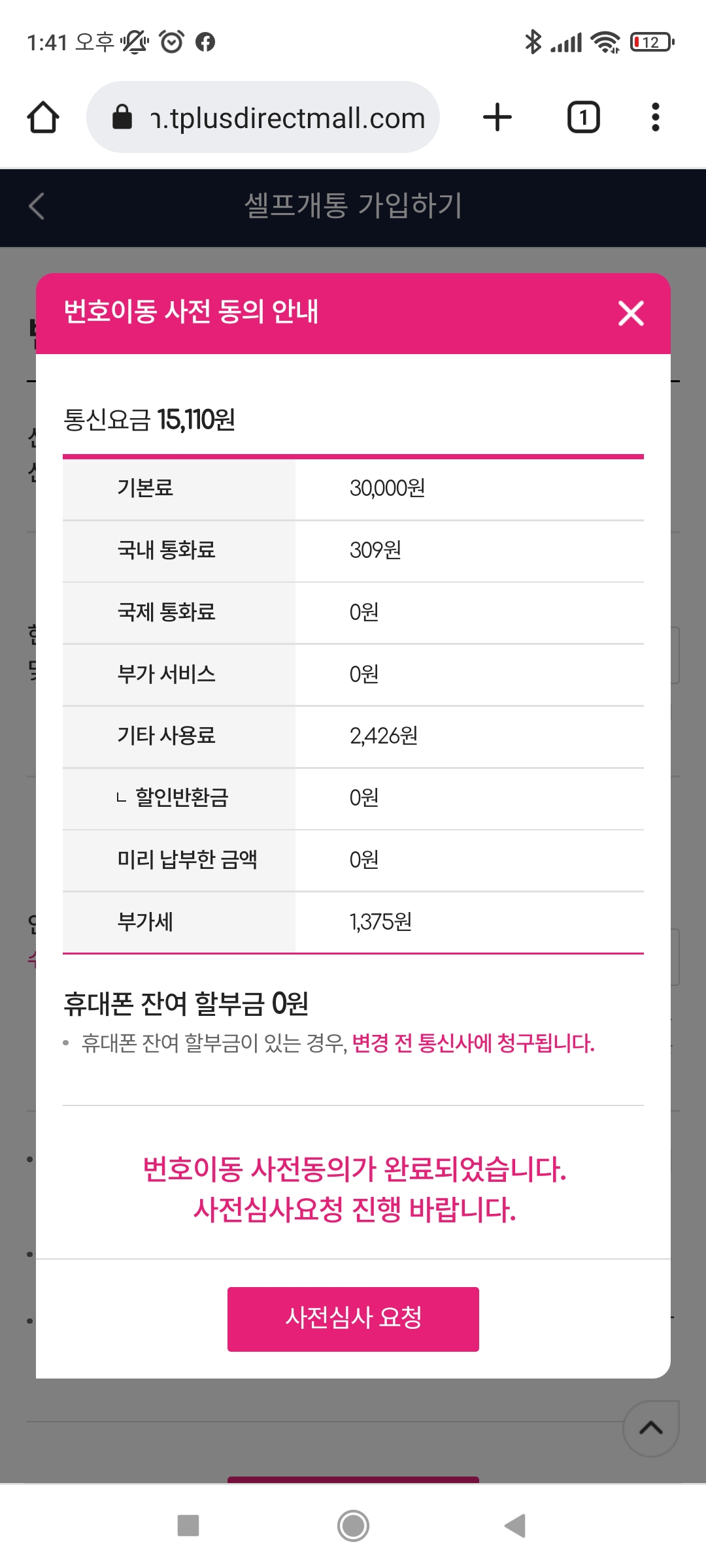 가입 절차를 처음부터 다시 시작했고, ARS로 기존 통신사에 전화를 걸었습니다. ARS 안내에 다라 가입자 생년월일과 번호이동하려는 전화번호를 입력하고 동의를 하니 사전동의 절차가 완료되었습니다. 그리고 핸드폰 인터넷상에 기존 통신사의 요금 정보가 표시됩니다. 앞서 사용하던 통신사에서의 마지막 요금은 새로 옮겨가는 통신사의 첫 달 요금에 포함되어 청구될 거라는 안내가 있습니다. 기존 사용하던 통신사의 [사전동의] 절차가 완료되면, 이번에는 티플러스 모바일의 [사전심사]가 이어집니다. 사전심사는 버튼을 누르면 순식간에 완료되어 달리 신경 쓸 것이 없습니다.