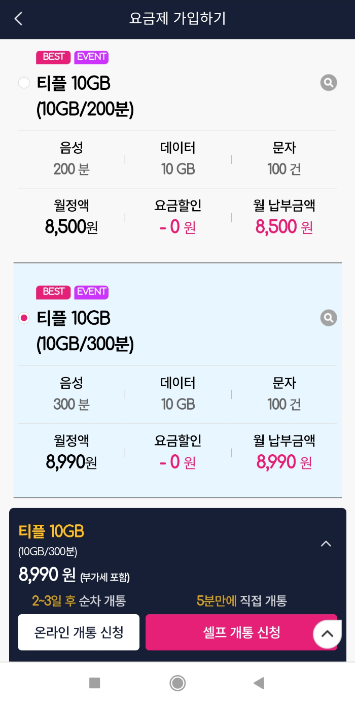 방랑을 잠시 멈춘 방랑객은 요즘 사무실에 머무는 시간이 많지만, 통화량도 넉넉하게 유지하고 싶어 티플 10GB + 300분 요금제를 선택하기로 했습니다. 방랑객이 기존에 사용하던 타사 알뜰폰 요금제는 12,000원 내외의 기본요금에 통화 3,000분 + 데이터 4GB가 포함되어 있었는데, 실제 통화량이 3,000분에 이르지 않기 때문에 통화량은 줄이고 데이터를 늘리는 게 좋겠다고 판단했죠. 그럼에도 가격은 약 25% 정도 절약할 수 있게 되었습니다.