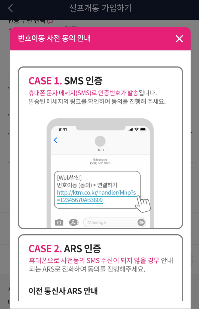 모든 정보가 제대로 입력되고  [사전동의 요청] 버튼을 누르면 아래와 같은 메시지가 나옵니다. 현재 사용 중인 통신사에서 승인을 해줘야 하는데, 승인 방법이 2가지입니다. 사용 중인 통신사에서 링크가 있는 문자가 오거나, 문자가 오지 않으면 ARS로 전화를 걸어 확인을 해야 합니다.