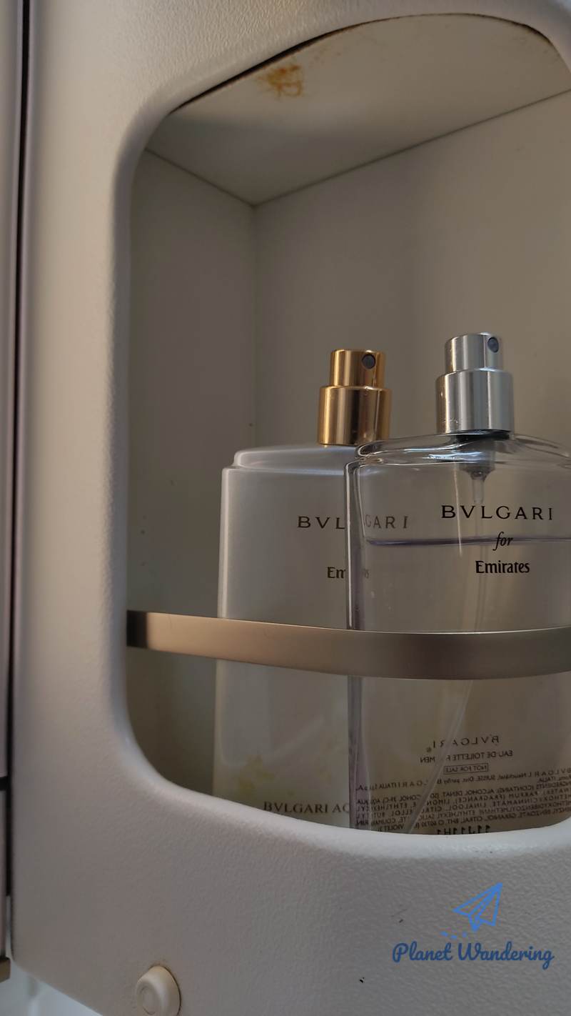 기본적으로 비행기 화장실은 공간이 좁기 때문에 이코노미나 비즈니스나 공간 면에서는 다를 바가 없습니다. 흔들림이 덜한 것도 아니죠. 약간 더 럭셔리한 느낌은 드네요. 제일 먼저 눈에 들어온 건 빗, 핸드로션, 그리고 양치세트입니다. 양치세트는 두바이공항 비즈니스 라운지에서 주는 제품과 똑같은 콜게이트 치약과 칫솔 세트입니다. 핸드로션도 나름 괜찮습니다.