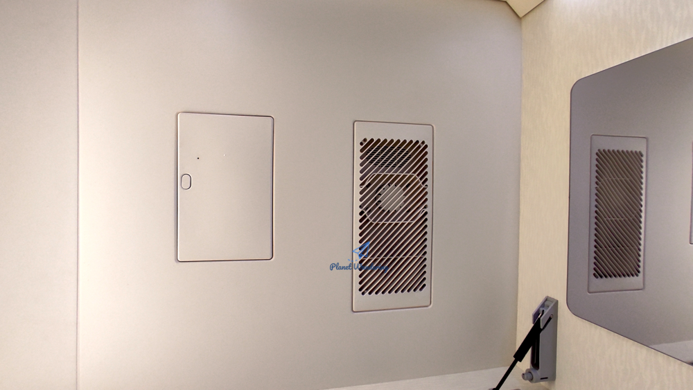 만약 용무 중에 발생할 수 있는 냄새가 걱정이 되신다면, 이 공기 토출구를 활짝 열어 두시면 도움이 됩니다. 바람을 타고 악취가 빠르게 흩어지겠죠. 그래도 냄새가 신경 쓰이신다면, 세면대 옆에 있는 향수를 공중에 한두 번 뿌리고 나오시면 됩니다. 호텔 객실 화장실에 전기면도기용 콘센트가 있지만 잘 안 쓰이는 것처럼, 비행기 화장실의 전기 콘센트도 거의 사용하지 않지만 있기는 있습니다.