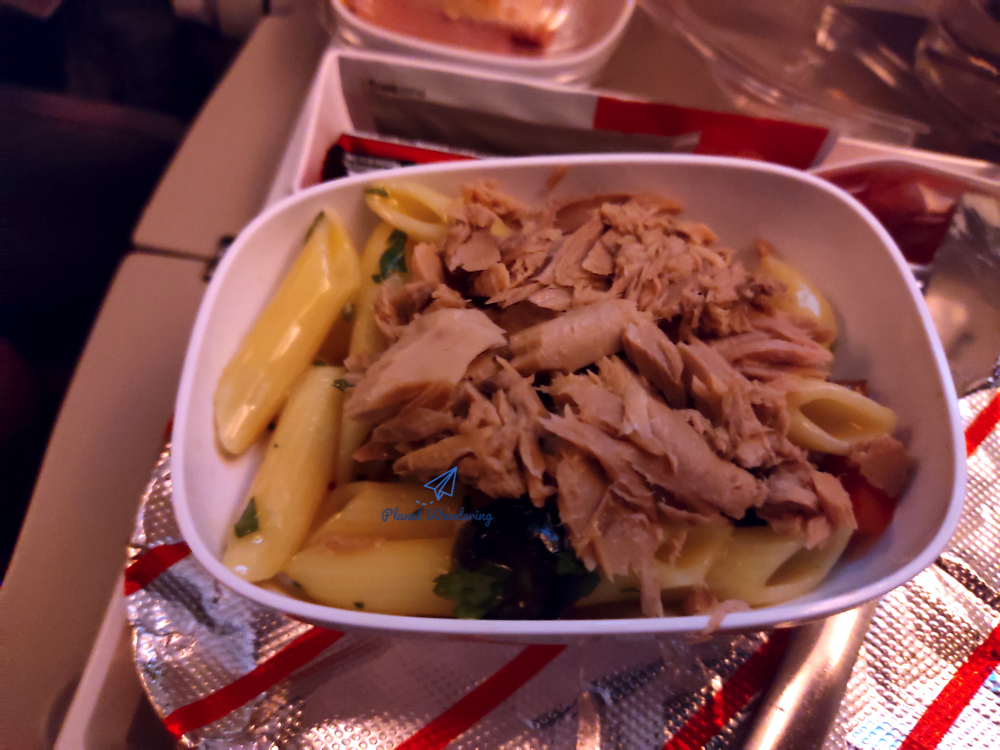 본격적인 메뉴 탐구에 들어가볼까요? 요 녀석이 애피타이저로 나오는 샐러드입니다. 파스타의 일종인 펜네와 참치가 있고 올리브와 방울토마토가 살짝 보입니다. 애피타이저로 먹기에 양이 좀 많아 보이네요. 맛은 좋습니다. 에미레이트 항공 기내식은 맛으로 불평할 정도의 수준은 아니니까요.
