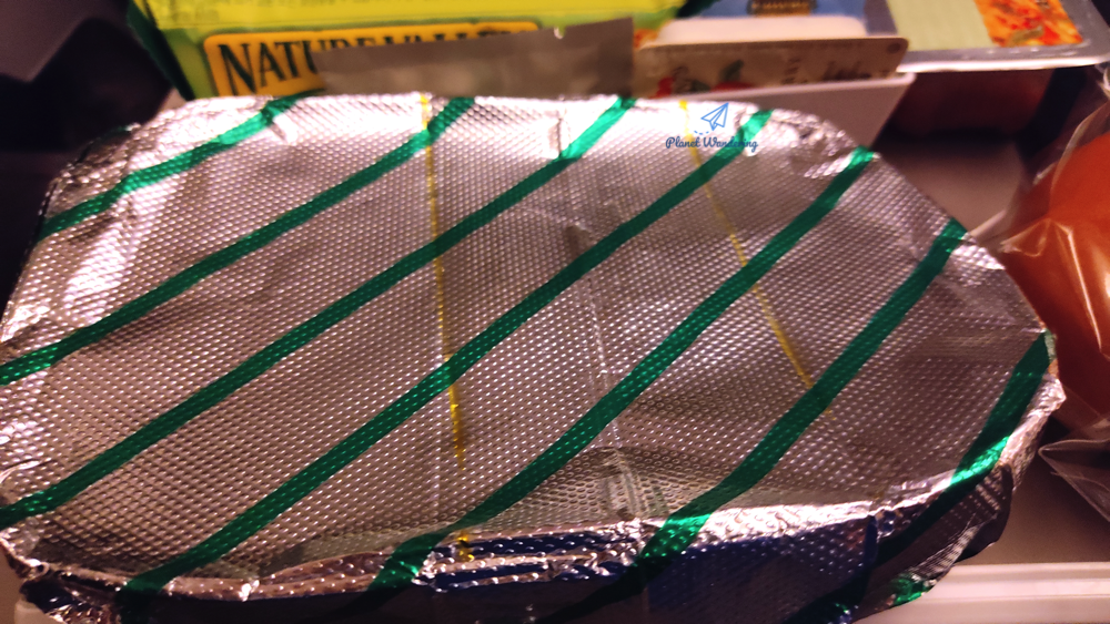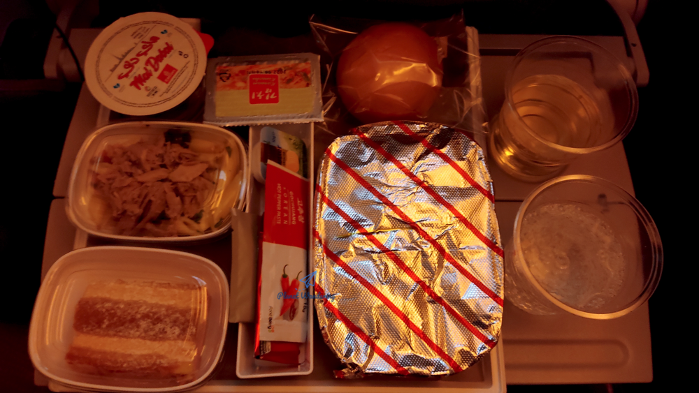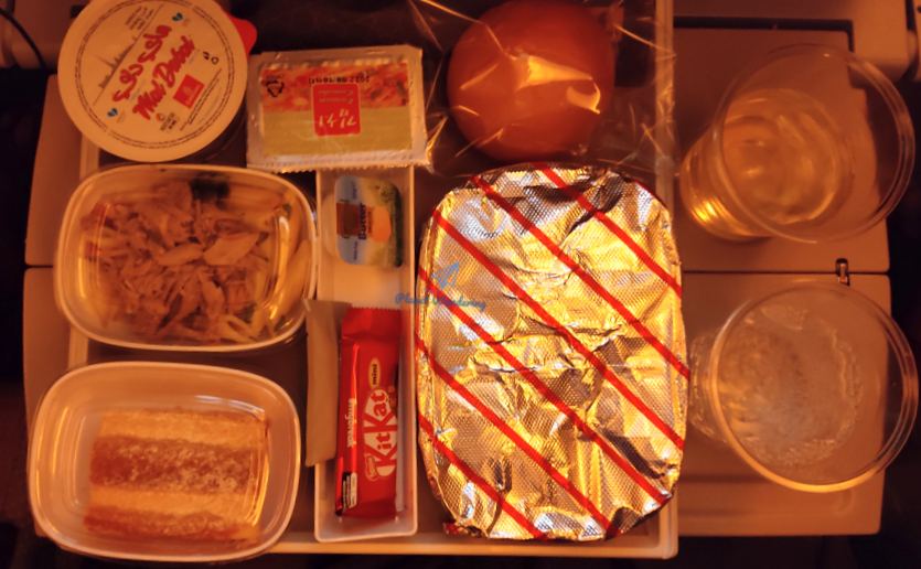 메뉴에 안내된 구성 그대로입니다. 알미늄 포일에 싸인 메인 메뉴, 빵, 김치, 애피타이저와 디저트가 있고, 100밀리리터 컵 용기에 담긴 생수도 나왔습니다. 가운데 작은 플라스틱 바구니에는 버터와 물티슈, 고추장, 키커 초콜릿이 담겨있습니다. 식판 위쪽으로 거뭇하게 보이는 건 스푼, 포크, 나이프가 들어있는 비닐봉지인데 이 안에 냅킨 한 장과 후추, 소금이 함께 들어있죠. 작년 가을까지만 해도 고추장은 작은 튜브 고추장이 나왔는데 이제는 맥도널드 케첩만 한 크기로 나오네요.