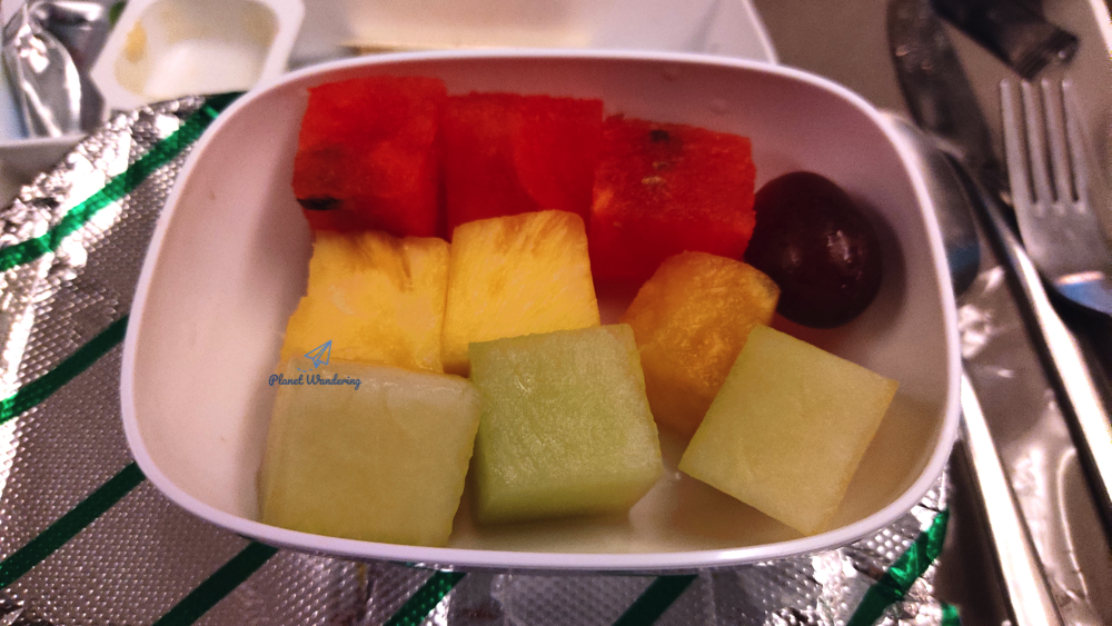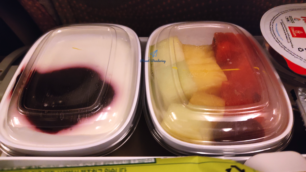 이제 아침 기내식의 마지막 과일 순서입니다. 집에서는 과일 후식은커녕 아침밥도 멋 챙겨 먹고 집을 나서는데 다채로운 과일로 호사를 누립니다. 여러 과일들이 나오는데 방랑객은 맛이 순한 과일을 먼저 먹습니다. 수박, 멜론을 먼저 먹고 파인애플로 마무리를 하죠. 맛이 강한 과일을 먼저 먹으면 나중에 먹는 맛이 연한 과일들이 맛을 느끼기 어렵거든요.