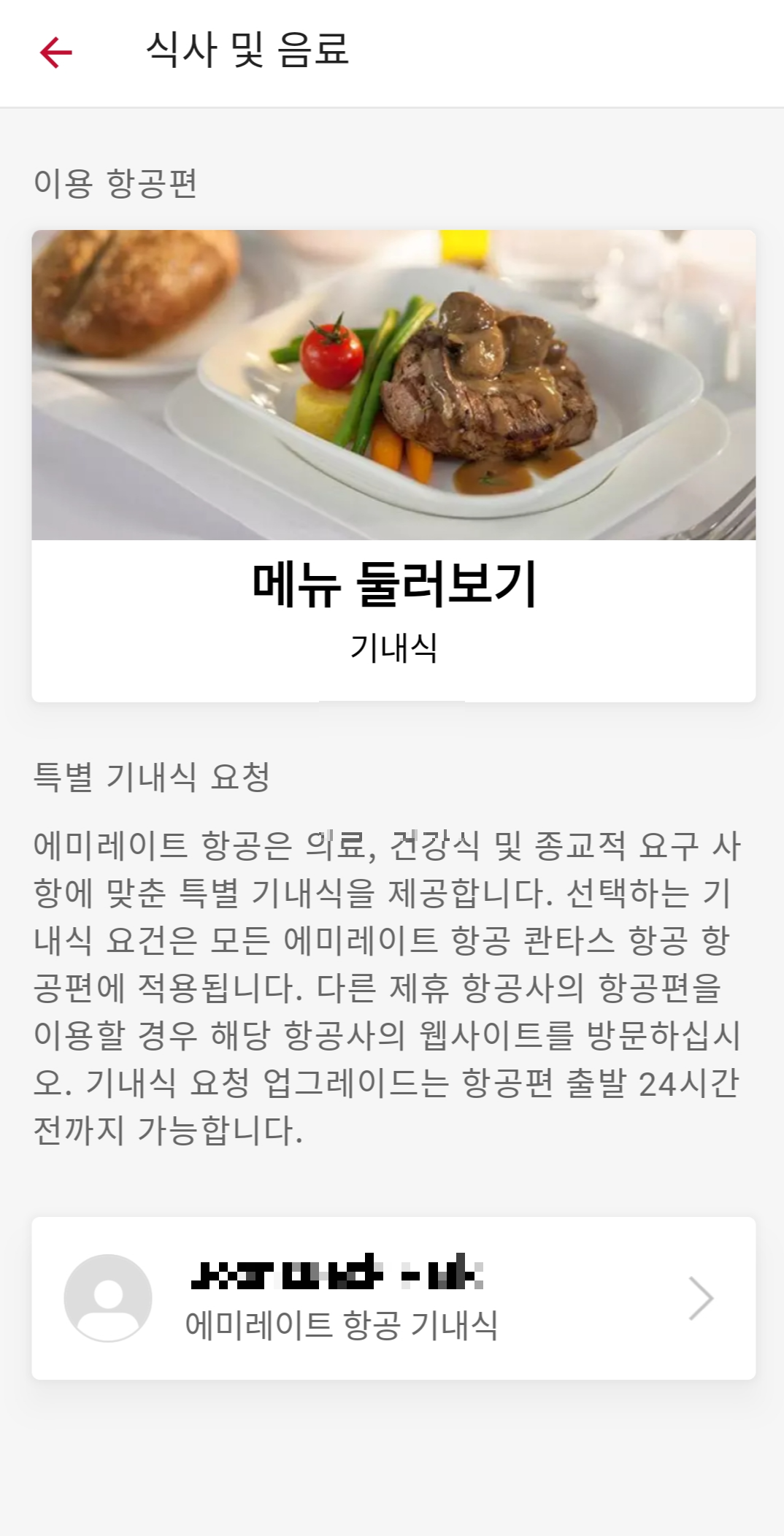 이 메뉴 이미지는 항공권 예약을 하고 출발일이 가까워지면 에미레이트항공 홈페이지에서 찾아볼 수 있는 이미지입니다. 내 여정을 선택하면 좌석 선택 항목과 함께 기내식에 관한 선택 메뉴가 나옵니다. 여기서 기본 기내식 메뉴를 볼 수도 있고, 저염식이나 채식, 종교와 관련된 식사를 선택할 수도 있습니다. 대신 출발 24시간 이전에만 특별 기내식 선택이 가능합니다.