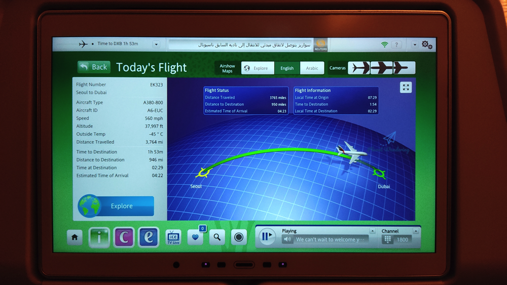 모니터를 켜서 비행기가 어디까지 왔는지를 살펴봅니다. 대충 7시간을 날아왔고 2시간 후면 두바이에 도착을 하겠네요. 한국은 대략 이른 아침이고, 5시간 늦은 두바이는 심야겠네요. 이제 아침밥을 먹고 조금만 버티면 두바이에 착륙을 하게 됩니다. 깊은 잠에 빠져있던 승객들도 대부분 눈을 떴습니다.