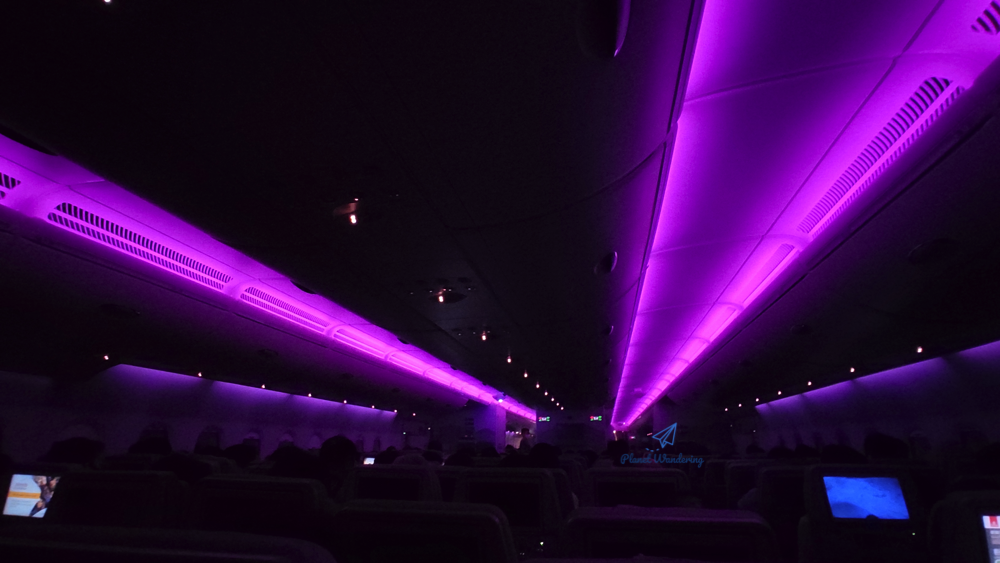 시간 차를 두고 조명이 점점 밝아집니다. 아마 심야에서 새벽, 여명, 일출로 향하는 분위기를 앰비언스 라이트로 연출하는 것 같네요. 해가 떴으니 다시 밥을 먹을 시간입니다. 취침시간에 자취를 감췄던 승무원들이 다시 분주하게 오가기 시작합니다. 자세히 살펴보면, 비행기 출발 때의 단정하고 예쁘게 꾸몄던 모습에서는 피곤이 지쳐 살짝 흐트러진 모습을 엿볼 수 있죠. 승무원 업무가 많이 고되겠지요.