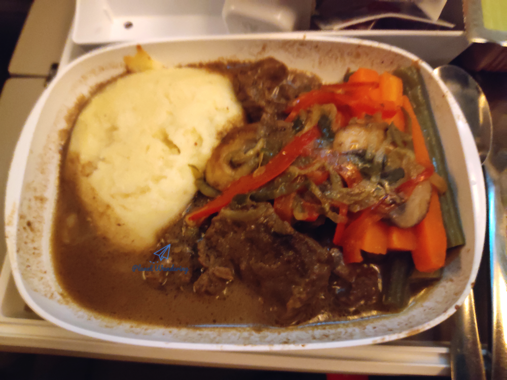 저녁식사 기내식으로 쇠고기 스트로가노프를 선택했습니다. 물론 승무원은 비프? 치킨? 으로 물었고 방랑객은 비프 플리즈 라고 대답했죠. 어느 비행기나 거의 비슷하듯이 기내식은 메인 요리 2종류 중에서 하나를 선택하고, 나머지 애피타이저나 디저트는 동일하죠. 점심이나 저녁식사로는 닭고기나 소고기가 대부분이고, 가끔 생선이나 야채 요리가 나오기도 합니다.