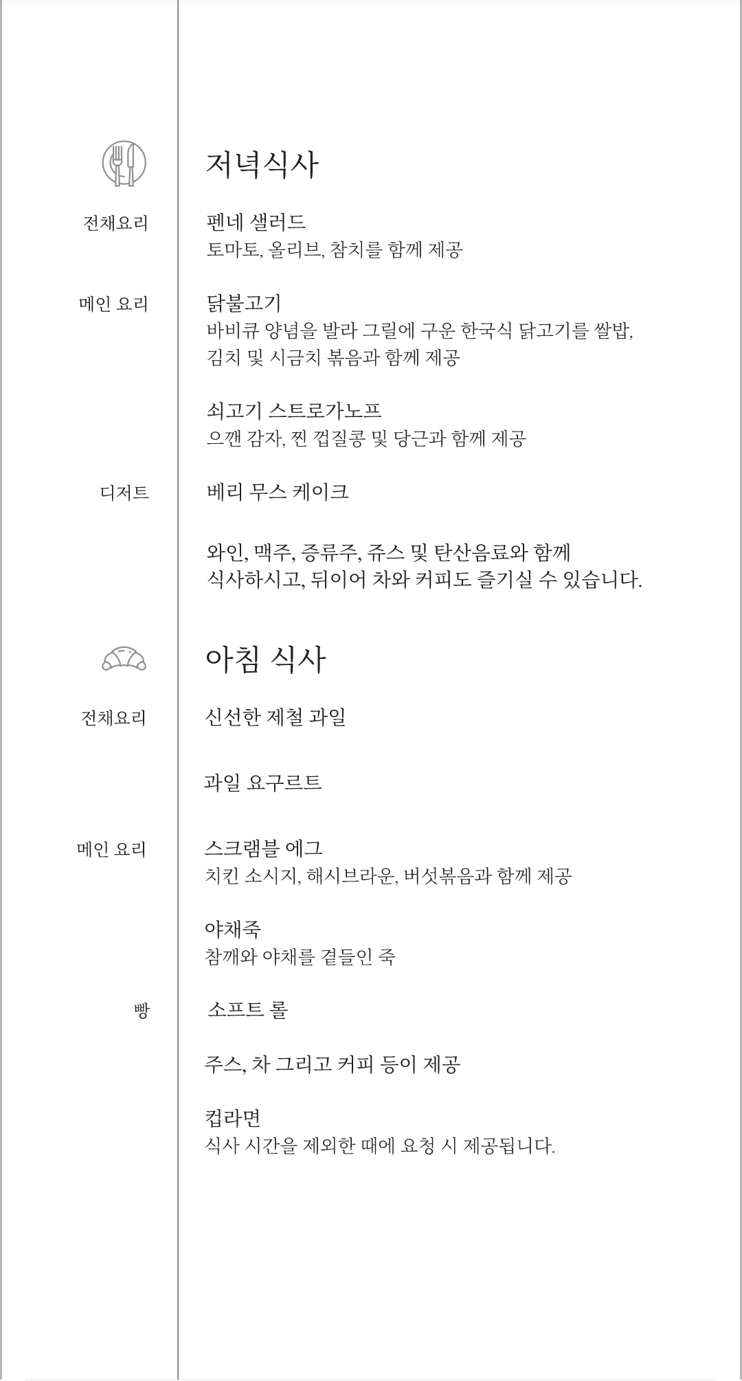 밥을 뭘 주는지 살펴볼까요? 영어 메뉴를 읽어보면 뭘 엄청나게 주는 것처럼 보이지만, 한글 메뉴를 보면 조금 더 깔끔하게 정리가 됩니다. 저녁식사는 닭불고기 또는 소고기 스트로가노프 2가지 중에 하나를 고를 수 있습니다. 승무원들이 일일이 요리 이름을 알려줄 수도 없으니 치킨? 비프? 이 정도만 물어보고 대답을 기다리죠.