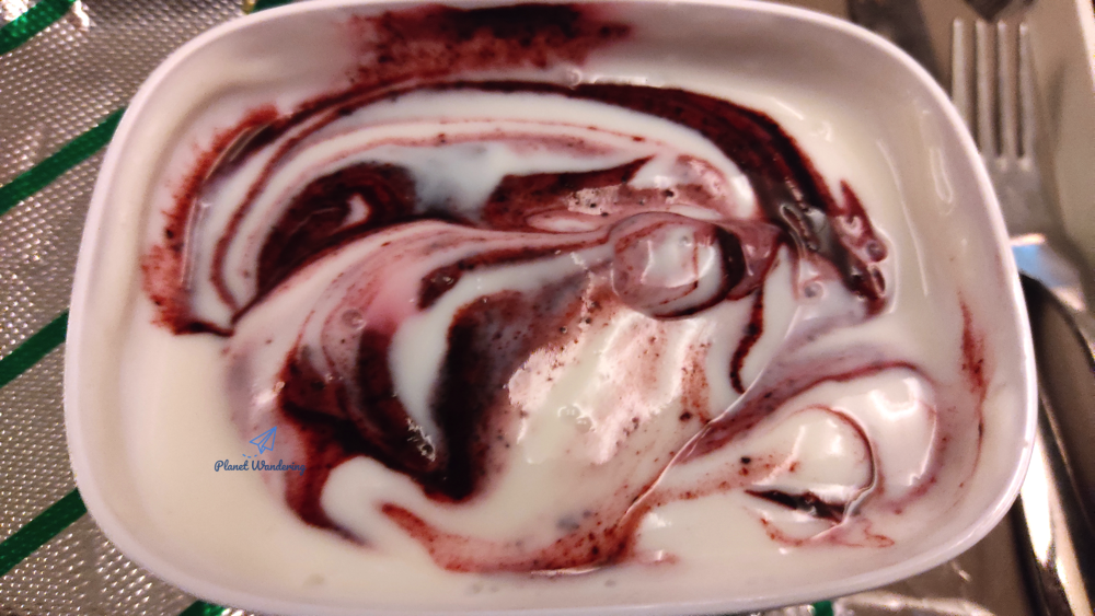 디저트로 나온 베리 무스 케이크입니다. 어디가 베리고 어디가 무스인지 잘 모르겠지만 기내식 한 끼를 마무리하는 달콤한 디저트로는 딱 좋네요. 이렇게 식사를 마치시고 잠시 기다리시면 승무원들이 식판 회수용 카트를 끌고 다니며 다 드신 기내식 쟁반을 회수합니다. 음료 컵을 따로 정리하고, 나머지는 카트 안으로 밀어 넣는데, 이왕이면 다 드신 그릇과 비닐들이 수북하게 쌓이지 않도록 정리해주시면 승무원들에게 도움이 됩니다.