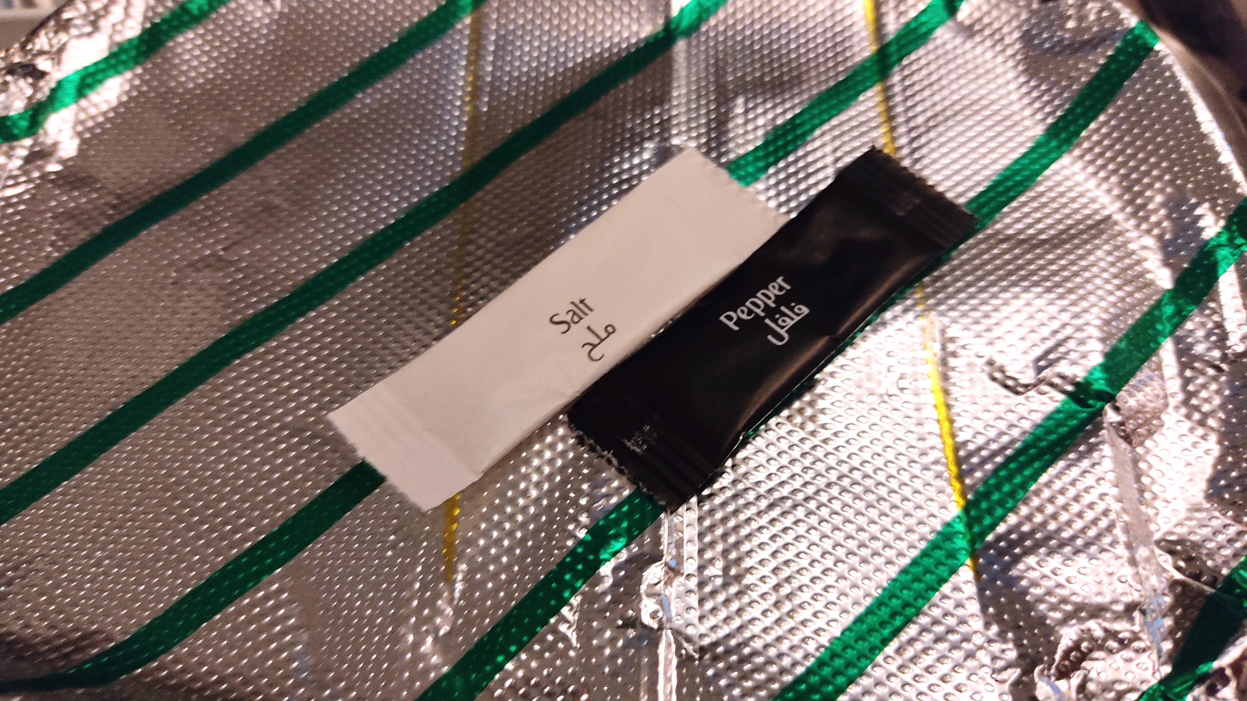 메뉴에 안내된 구성 그대로입니다. 알미늄 포일에 싸인 메인 메뉴, 빵, 김치, 애피타이저와 디저트가 있고, 100밀리리터 컵 용기에 담긴 생수도 나왔습니다. 가운데 작은 플라스틱 바구니에는 버터와 물티슈, 고추장, 키커 초콜릿이 담겨있습니다. 식판 위쪽으로 거뭇하게 보이는 건 스푼, 포크, 나이프가 들어있는 비닐봉지인데 이 안에 냅킨 한 장과 후추, 소금이 함께 들어있죠. 작년 가을까지만 해도 고추장은 작은 튜브 고추장이 나왔는데 이제는 맥도널드 케첩만 한 크기로 나오네요.