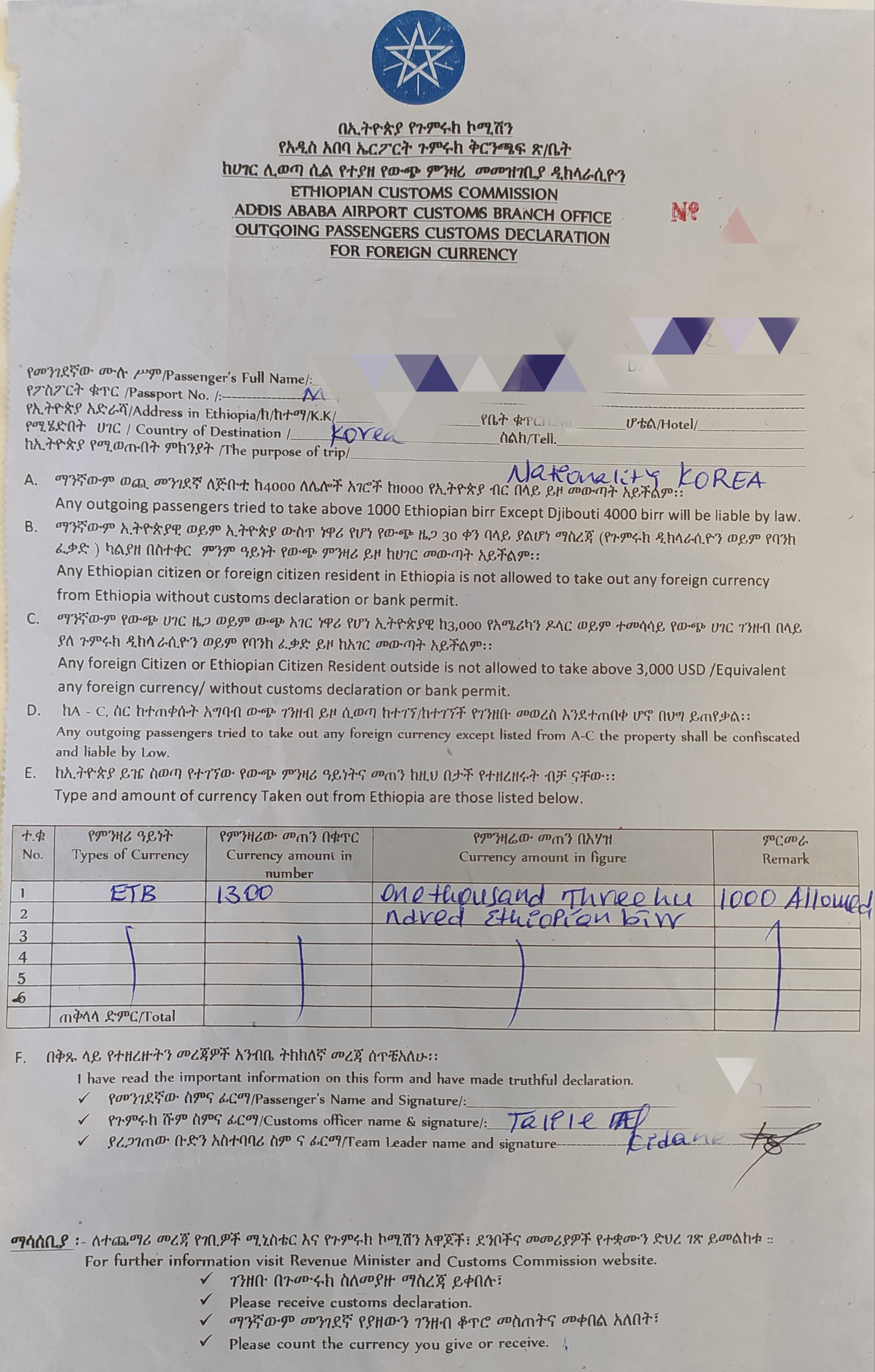 에티오피아 입국하실 분들은 1000비르 이상을 가지고 들어가거나 나오다 걸리면 초과분 압수당할 수 있다는 거 기억하세요.