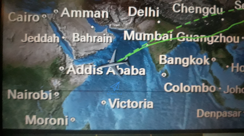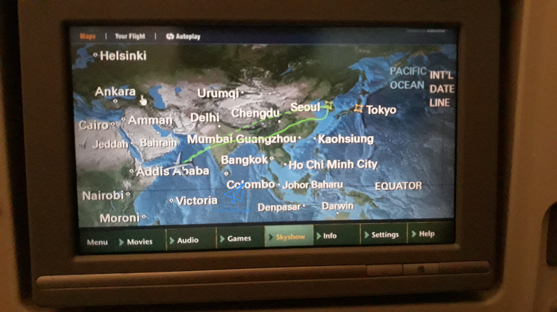 사실 에티오피아항공은 일본 도쿄에서 출발해 인천공항에서 몇시간 머물며 우리나라 승객을 태운 후 에티오피아로 날아갑니다. 모두들 내렸다 타기 때문에 대충 봐서는 알 수 없지만, 일본에서 출발해 우리나라에 머문 후 다시 날아가는 거죠. 그 흔적이 개인 모니터 내비게이션에 남아있었습니다. 모니터에는 도쿄에서 출발한 비행기가 서울을 향해 날아오고 있네요.