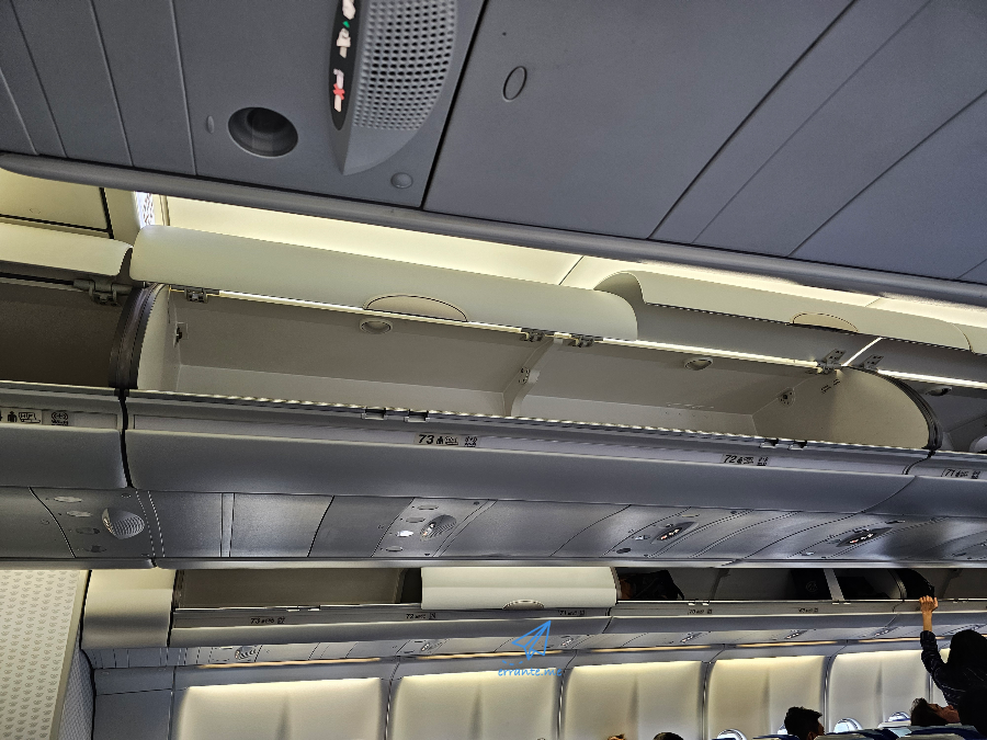 머리 위 선반은 비교적 여유롭습니다. 머리 위 선반의 여유로움은 비행 노선에 따라 특성을 타기도 합니다. 어떤 노선에는 유달리 기내용 캐리어를 들고 타는 분들이 많아 선반이 복잡하기도 하죠. 다행히 짐 보관 때문에 당황해하는 분들은 없었습니다.