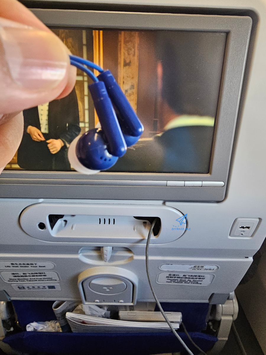 이어폰도 승무원에게 요청을 해서 받을 수 있습니다. 아주 얇고 단순하게 만든 이어폰인데 승무원들도 착륙 전 이어폰을 수거해서 쓰레기 봉투에 넣는 일회용 개념입니다.