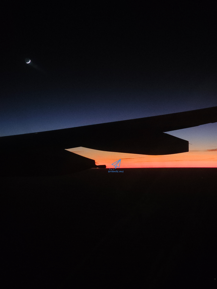 비행기는 서쪽으로 계속해서 날아가고 퇴식 정리를 마친 승무원들이 객실 조명을 낮추고 승객들 잠을 재웁니다. 창문 가리개를 올리니 지평선 너머로 해가 지고 달이 떠오릅니다.