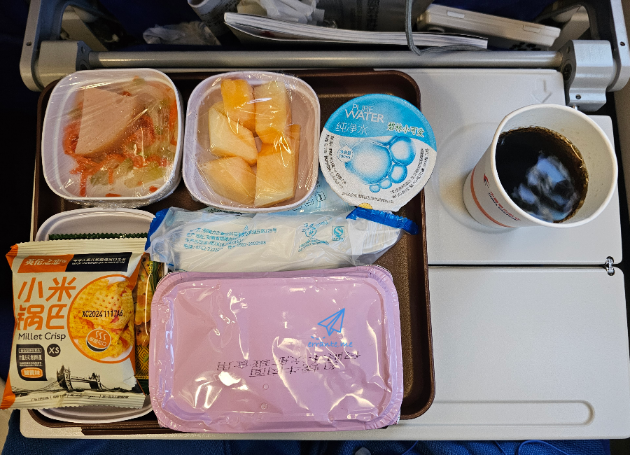 승무원이 메뉴 두 개 정도를 말해줬는데 알아 듣지를 못했습니다. 그냥 뭐라고 묻길래 맞다고 했더니 소고기 볶음면을 내줬습니다. 음료도 선택이 가능해서 콜라를 주문했습니다.