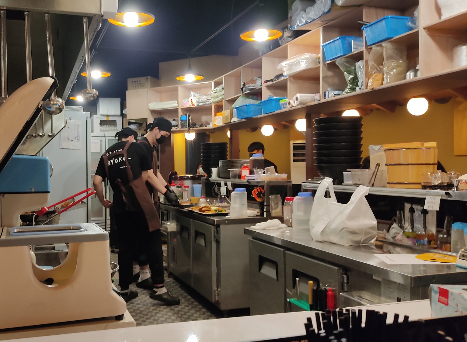 손님의 음식 주문도 오른쪽 구석의 자동주문기를 이용하기 때문에, 주문받고 결제하는 과정을 기계에 맡기고 직원들은 음식 조리에만 열중할 수 있어 좋습니다. 단 하나 아쉬운 점은 주방 가장자리를 따라 좌석이 있다보니, 많은 손님을 받기 어렵고 손님들 사이로 한자리씩 비어있을 때 일행 단위 손님이 들어오면 앉을 자리가 마땅치 않은 것이죠. 좌석 의자 밑에 커다란 바구니가 매달려 있는데, 개인 가방을 내려놓는 공간입니다.