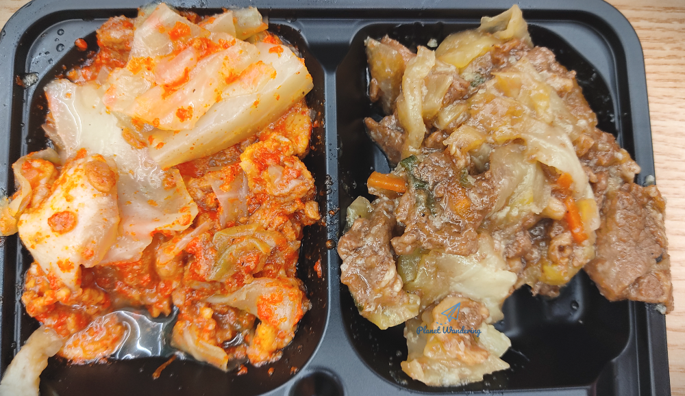 백종원 고기두배정식 도시락을 좀 더 자세히 살펴볼까요? 가장 중심이 되는 2종의 불고기가 보입니다. 매콤불고기는 고기보다 양배추가 더 많이 들어있어 아쉽습니다. 그냥 보면 김치찌개인가 싶을 정도로 고기보다 야채의 양이 많아 보입니다. 식감도 양배추가 많이 씹히고 매운 양념도 조금 낯설게 느껴질 수 있습니다. 간장불고기는 다행히 고기가 더 많고 편의점 도시락에서 익숙하게 맛보는 달콤한 맛이라 누구나 맛있게 드실 수 있을 것 같네요.