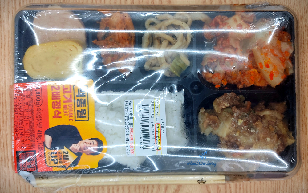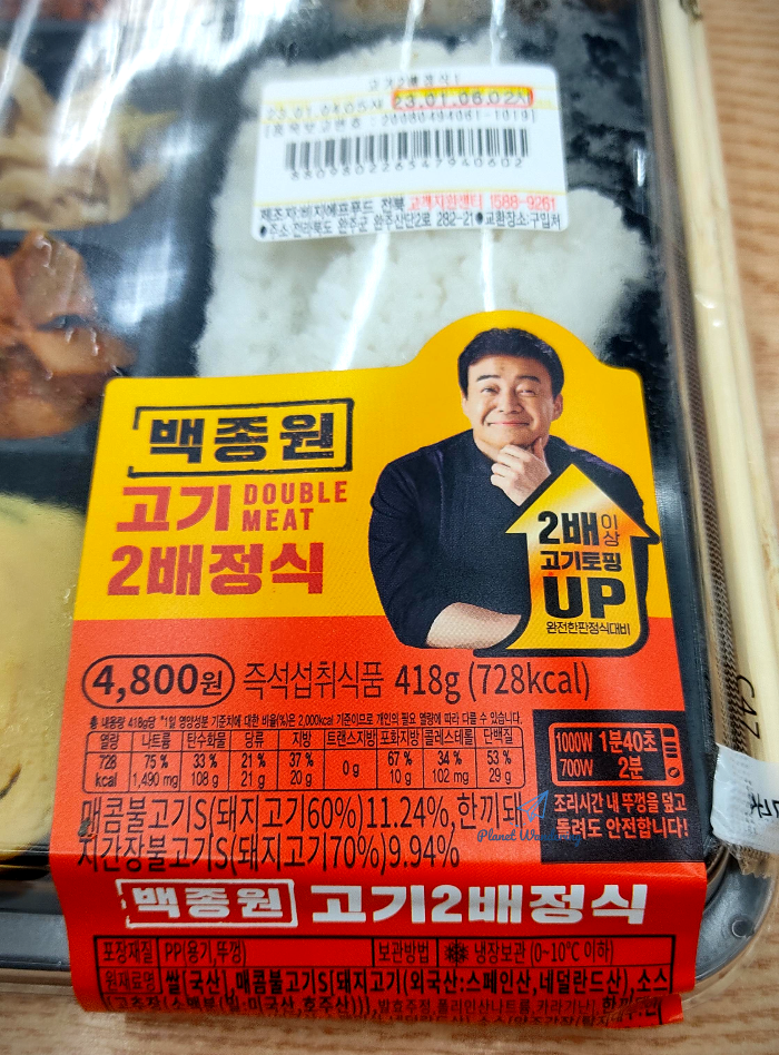 씨유 편의점에서 판매하는 백종원 고기2배정식 도시락 입니다. 가격은 4,800원으로 편의점 도시락 중에는 중간 값이라 할 수 있겠네요. 고기 2배의 의미는 2종류의 불고기 반찬이 들어있다는 건데, 돼지고기로 만든 매콤불고기와 간장불고기로 구성되어 있죠.