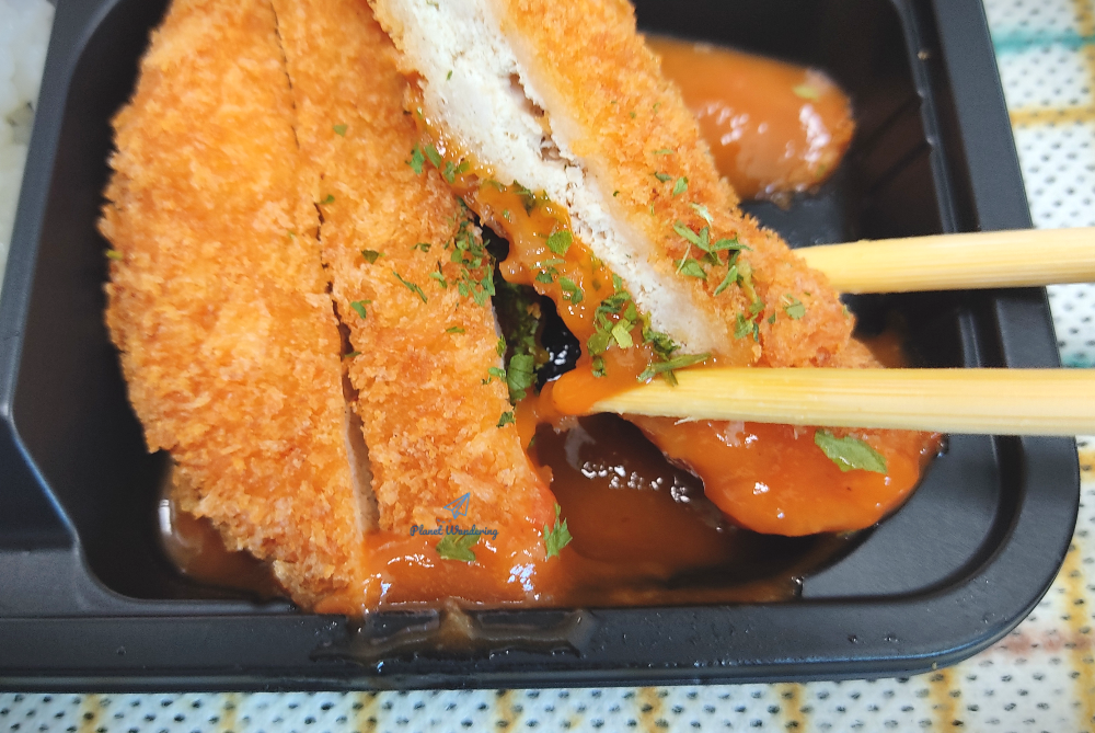 모양과 크기가 서로 비슷하지만, 왼쪽은 치킨까스이고 오른쪽은 돈까스입니다. 돈까스 밑으로는 토마토가 들어간 붉은빛의 소스가 깔려있고, 치킨까스 밑으로는 노란빛의 머스터드 소스가 깔려있죠. 편의점 도시락이니 갓 튀겨 나온 돈까스와 비교할 수 없겠지만 그리 눅눅하지도 않고 부드러운 식감을 냅니다.