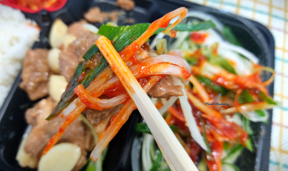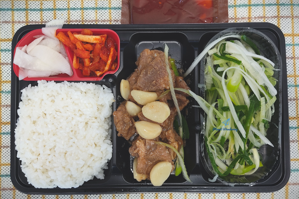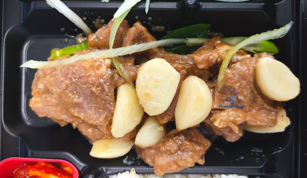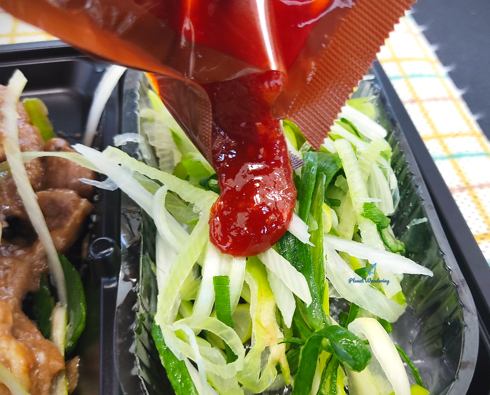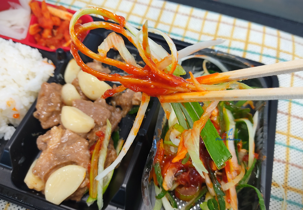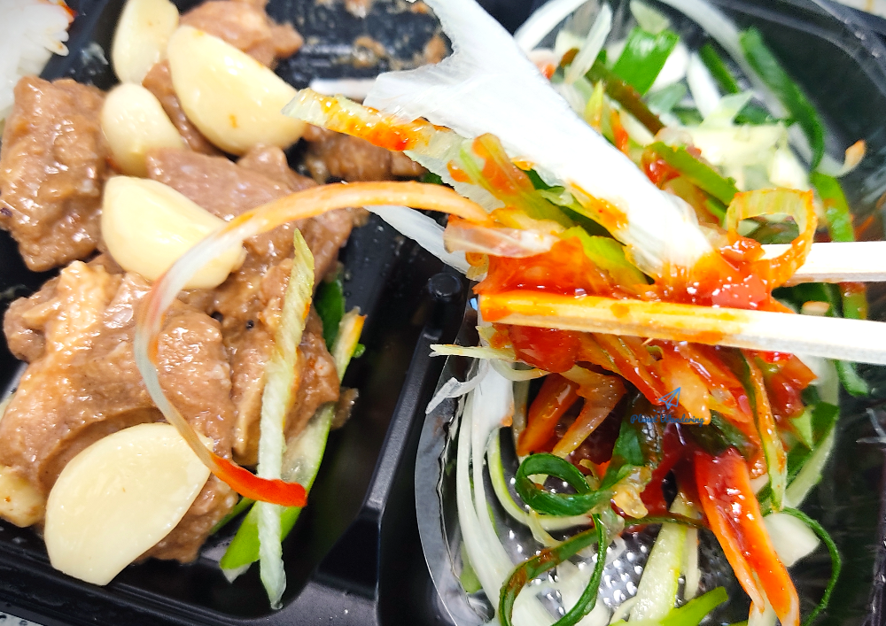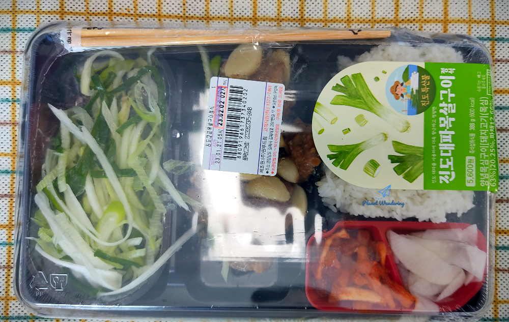 진도의 명물 대파는 너무 싱싱합니다. 도시락 유통과정이 있었을텐데도 숨도 죽지 않고 파릇파릇하네요. 아사삭 씹히는 파를 부드러운 돼지고기와 함께 먹는 건 좋은데,, 이 날 도시락에 들어있는 파는 향과 맛이 상당히 센 편이었네요. 코가 뽕~ 뚫릴 만큼 파 향이 강해서 드시는 분들 호불호가 좀 갈릴 것 같기도 합니다.