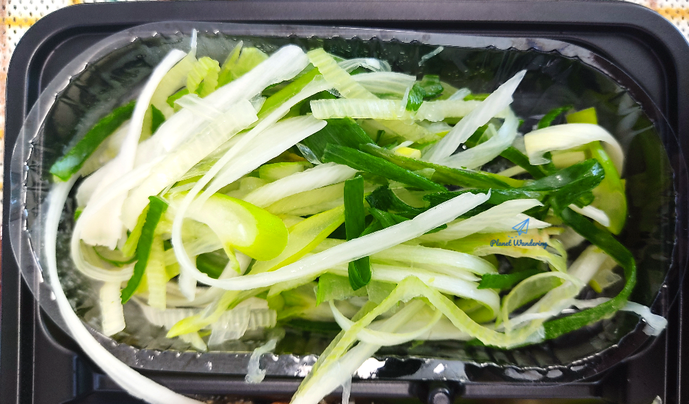 채썬 파는 국산, 정확하게 전남 진도산입니다. 진도가 대파의 유명 산지인데, CU에서 진도산 대파를 모티브로 하여 도시락 상품을 만들었네요. 파는 다른 양념이나 가공 없이 채 썬 그대로입니다. 도시락 뚜껑을 열면 찌릿한 파 냄새가 올라오죠. 세로로 길게 채 썬 대파라서 도시락으로 먹기에는 조금 번거롭기도 합니다.