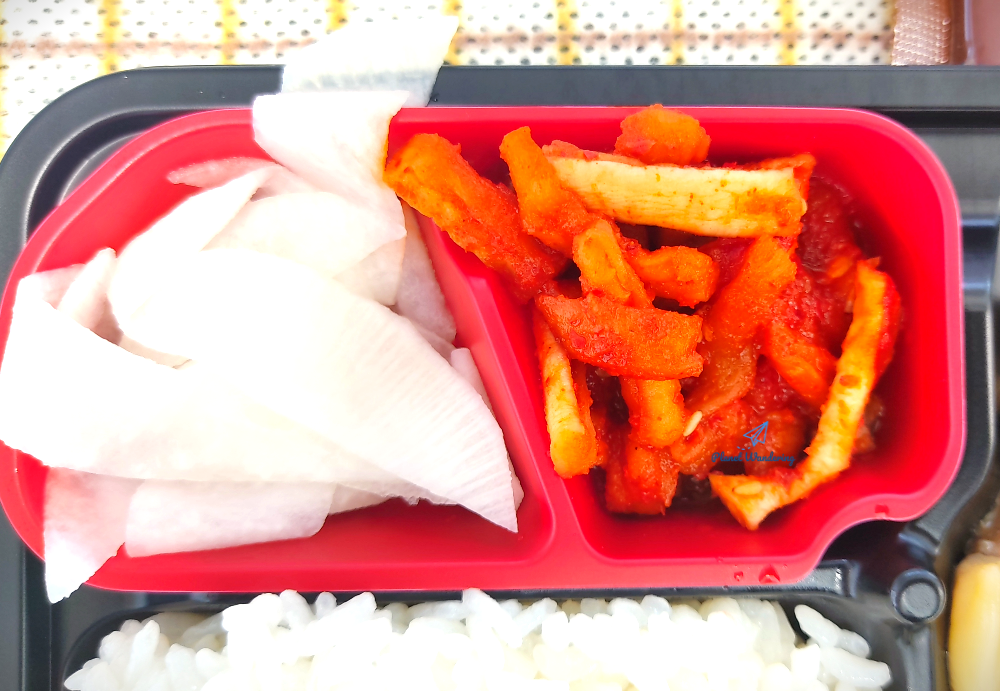 잔 반찬으로 무말랭이 무침과 무 초절임이 나왔습니다. 매콤한 무 말랭이는 목살구이와 잘 어울리는 것 같은데 무 초절임은 냉면이나 밀면의 단짝인데 도시락에 나오니 조금 낯설게 느껴집니다. 요즘은 도시락 내용물이 다양하기 때문에 통째로 전자레인지에 데우면 안됩니다. 대파목살구이 도시락도 무초절임이 들어있는 빨간 용기와 대파가 들어있는 투명 용기는 빼내고 밥과 고기만 전자레인지에 돌려야 합니다. 물론 대파 밑에 깔려있는 파절이 소스도 빼놓고 전자레인지에 돌려야겠죠.