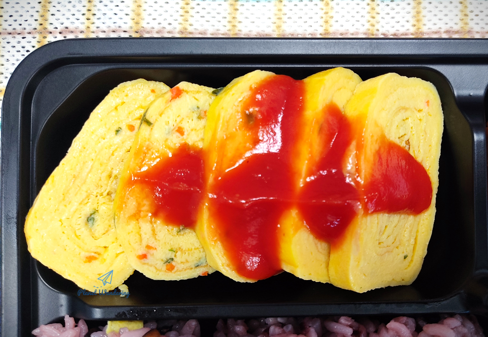편의점 도시락 중에는 색상이 상당히 화려합니다. 밥도 잡곡밥이고 달걀말이가 이렇게 많이 들어있는 도시락도 처음 보는 것 같네요. 계란말이 위의 토마토 케첩은 방랑객이 뿌린 게 아니라 원래 이렇게 뿌려져 왔죠. 달걀말이 속으로 당근과 파 같은 야채도 살짝살짝 보이는 게 아주 맛깔스럽습니다. 실제 맛도 식당에서 반찬으로 먹는 계란말이와 큰 차이가 없을 정도로 맛있습니다.