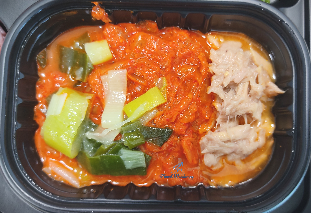 오늘의 주인공 참치김치찌개를 영접할 차례네요. 그리 큰 양은 아니지만 도시락 속 별도 용기에 김치찌개와 참치가 구분되어 들어있습니다. 김치찌개는 국물은 많지 않게 만들어 배송할 때 흐르지 않도록 신경을 쓴 것 같네요. 진짜 김치찌개 냄새가 올라와 군침이 도는데, 사무실 안에서 먹기에는 냄새가 좀 강한 것 같이 창문부터 열어야 했습니다. 아마 전자레인지에 돌려 뜨겁게 만들었다면 냄새가 좀 더 날 것 같았습니다.