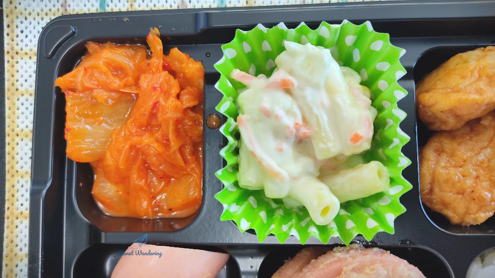 식품 관련 법규에 따라 편의점 도시락에는 생김치를 넣을 수 없다고 하죠. 그래서 모든 편도에는 볶은 김치가 대신 들어 있습니다. GS25 정찬한판 도시락의 볶은 김치도 맛이 괜찮았습니다. 함께 들어있는 마카로니 샐러드는 놀라운 맛을 냈는데요, 제법 크기도 큰 마카로니에 소스가 아주 달콤하고 담백한 것이 지금까지 먹어본 마카로니 샐러드 중 최고라 해도 과언이 아닐 정도로 좋은 맛을 냈습니다.