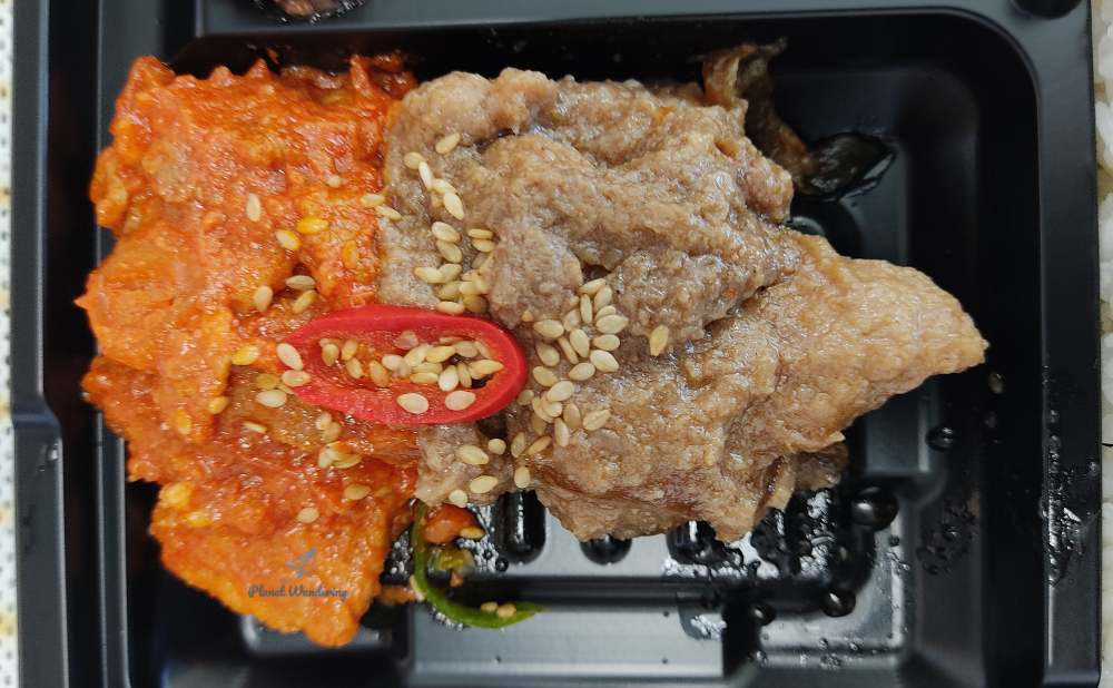 2종류의 불고기는 양이 많지는 않지만 맛은 좋았습니다. 간장 불고기는 달콤한 맛에 식감과 육질도 아주 괜찮았고, 고추장 돼지 불고기는 보기보다 맵지도 않고 부드러운 맛이 좋았습니다. 방랑객은 전자레인지를 좋아하지 않아서 차갑게 있는 그대로 먹었지만, 전자레인지를 선호하시는 분들은 따뜻하게 데워 드시면 훨씬 더 부드럽고 맛있게 드실 수 있겠네요.