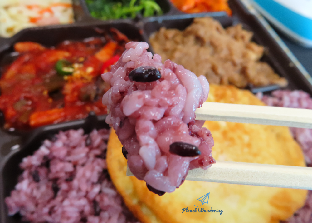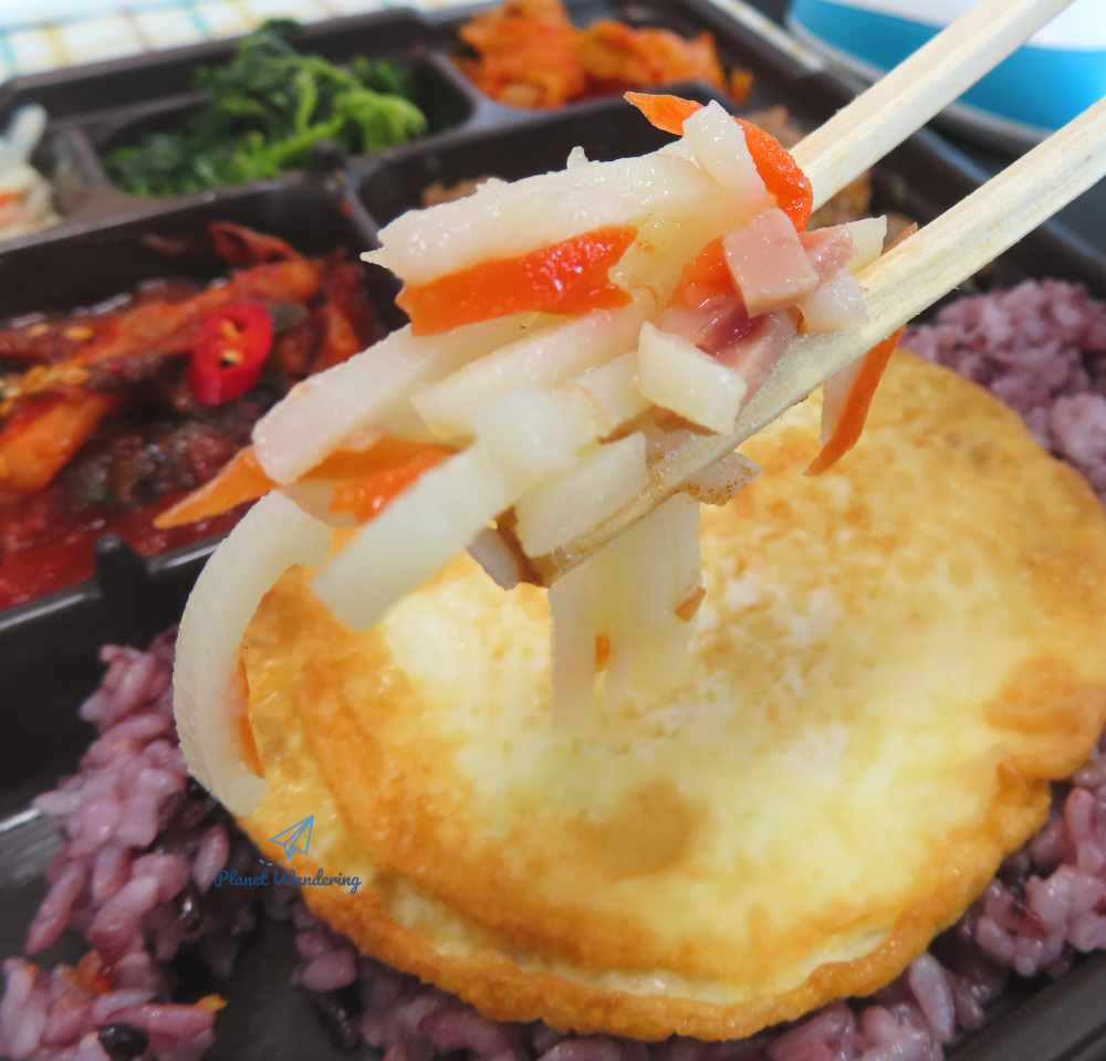 흑미밥은 혜자로운 도시락의 밥으로 구성되는데, 색깔은 거뭇거뭇하지만 평소에 잘 안 먹는 잡곡이 섞인 밥이라 아무래도 건강에는 더 좋을 것 같습니다. 도시락 공장에서 어떻게 밥을 담는지는 알 수 없지만 하루 정도 유통과정을 거쳐 먹게 되는데도 밥이 축 처지거나 딱딱하게 굳지 않고 포슬포슬 부드러운 식감을 냅니다.